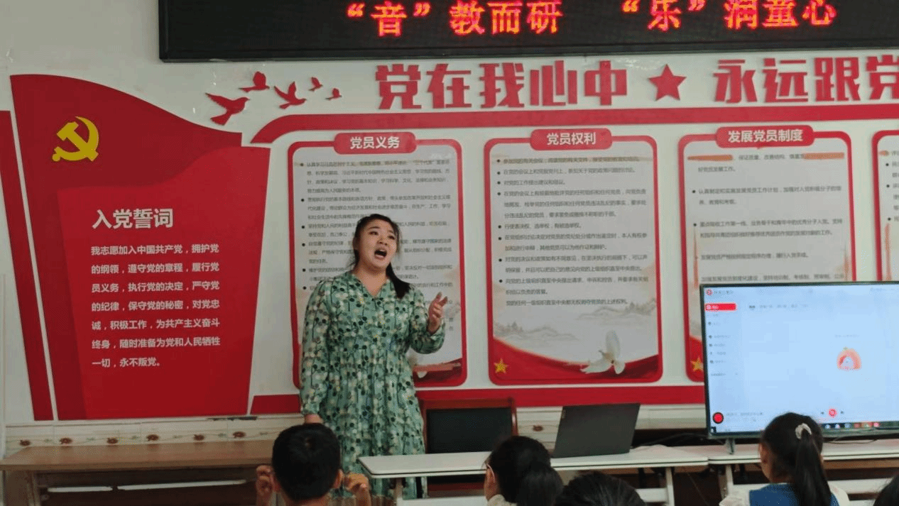 徐樱宁同学设计“阿拉马灯调”音乐课。她在生动讲述《马灯调》历史背景后,巧妙引导孩子们通过拍击身体与桌面掌握节奏,融入“比心律动”互动游戏。欢快节拍中,孩子们不仅习得传统曲调,更在协作中培养了乐观团结的精神,完美诠释了“寓教于乐、润物无声”的美育真谛。